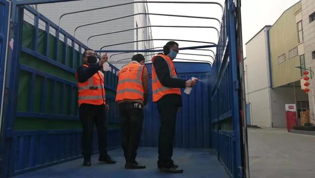 往返疫区运输物资车辆经由工作人员全面消毒后待重返疫区,为一线医护人物保障绝对安心、放心的救灾物资