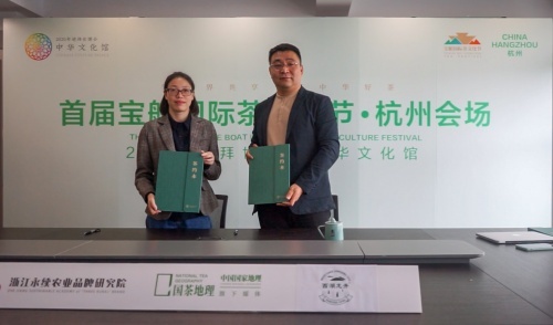 浙江永续农业品牌研究院副院长方赞文女士与国茶地理总经理边亦涛先生签订战略合作协议