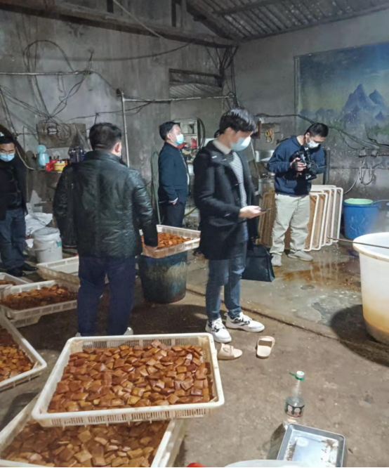 检查发现,正在加工间内制作香干的人是来自湖北的周某夫妻二人,他们去年11月开始在此租赁民房一楼进行豆制品加工。加工间室内昏暗,墙壁发黑,房顶是用积满灰尘的彩条布遮挡着,地上污水四流,盛装豆制品的塑料器皿污迹斑斑,加工用具随意挂在墙上,或横七竖八放在地上,10多个镂空塑料筐装着做好的豆腐摆在了积满污水的底板上。且加工间内没有任何防鼠防蝇防虫设施,操作人员穿着随意,没有穿工作服、戴口罩、手套等。整个作坊场面脏乱不堪,弥漫着一股难闻的异味。据周某交代,该小作坊日产豆制品约100公斤,主要销往资阳区桥北几家大型农贸市场。