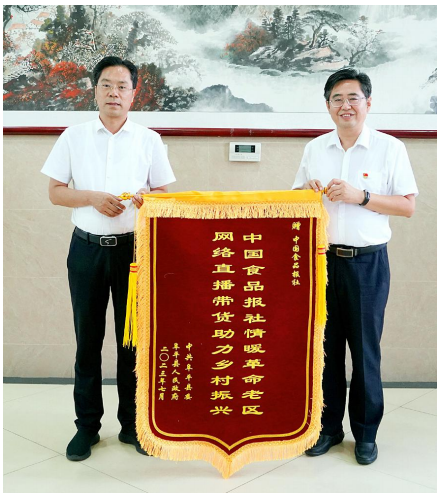 阜平县委书记王占祥(左)向中国食品报社赠送锦旗
