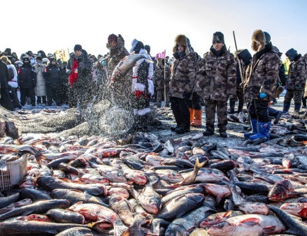 近日,由黑龙江省鸡西市人民政府主办的“鸡西兴凯湖冬捕节”在鸡西市密山市新开流景区举办,超5万名游客相聚于此,共同感受冬捕“渔歌盛事”,领略冰雪魅力。近年来,冬捕节已成为当地冬季冰雪旅游的重头名片,2015年被列入黑龙江省非物质文化遗产保护名录。图为“冰湖腾鱼”壮观场面,1500米长的大网共捕鱼约7万斤。