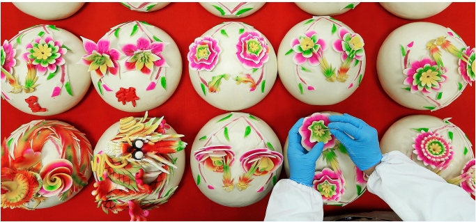 春节临近,山东省青岛市即墨区的民间艺人忙着赶制花馍等特色面食,通过“线上+线下”的销售模式供应各地年节市场。花馍是当地的特色面食,造型多样。