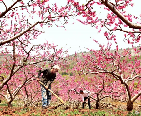 图①为近日,山东省枣庄市孟庄镇杜庄村果农在桃树下劳作。