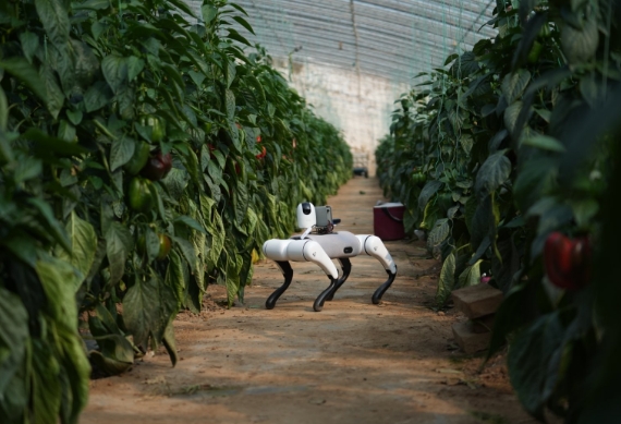 在寿光市现代农业高新技术试验示范基地的蔬菜大棚内,巡检机器狗代替农业技术人员巡检蔬菜生长情况。