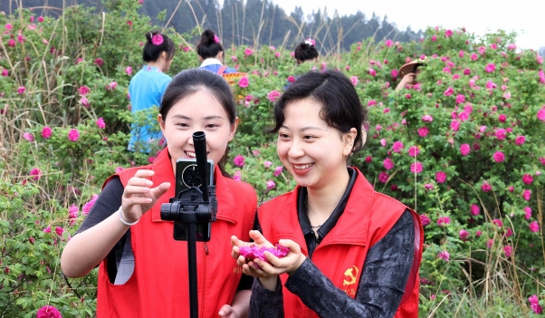 图为近日,该县新州镇“村播”小分队的党员志愿者在五里墩村食用玫瑰花种植基地直播。