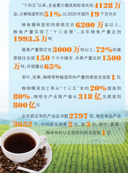 种业是产业的核心竞争力。云南省在良种推广应用、推动重点产业在新品种推广使用上走在全国前列。建设3个国家级制种大县、10个国家良种繁育基地、60个省级种业基地,吸引300多家科研单位和头部企业来云南育种制种、年产值超过100亿元。瑰夏、铁皮卡等咖啡优质品种种植面积达16.2万亩,在全省咖啡种植面积的占比从“十三五”末的5%提高到现在的13%,带动咖啡精品率从8%提高到31.6%。
