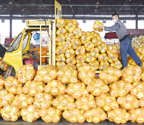 图为1月9日,在柳州一家农产品批发市场水果交易区,工人正在装运水果。