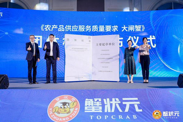 7月2日上午,大闸蟹行业首个供应服务质量团体标准——《农产品供应服务质量要求——大闸蟹》(T/CAS 740-2023)在宁夏银川发布。来自上海蟹状元企业发展有限公司董事长高超,中国标准化研究院、消费品安全与质量感知实验室主任刘霞,中国标准化协会团体标准部副主任/高工蒋可心,中国新食消费论坛副总裁王建业先生共同参宣布了标准发布。