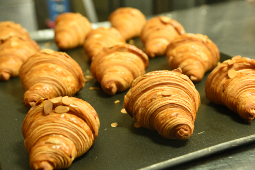 2、杏仁牛角:将发酵好的牛角包表面装饰杏仁酱和杏仁片、筛糖霜,上火190下火180°C烘烤约20分钟。