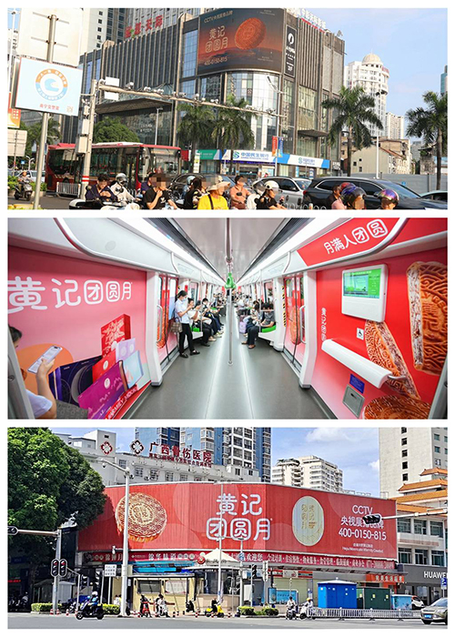 广西月饼市场竞争激烈,“酒香也怕巷子深”,广告是企业营销推广的重要手段。在南宁地铁1号线投放全车广告,在地铁1、3、4号线以及在华丰城、金湖广场电信大厦、朝阳西关新天地、丽源天际、小区电梯等投放视频广告,在兰海高速公路南宁至北海段、江南万达十字路口、东葛新民路口、北大路天桥、明秀路天桥、小区道闸等投放广告牌……黄记团圆月的广告遍布南宁市区,占据了月饼行业广告的领先位置。