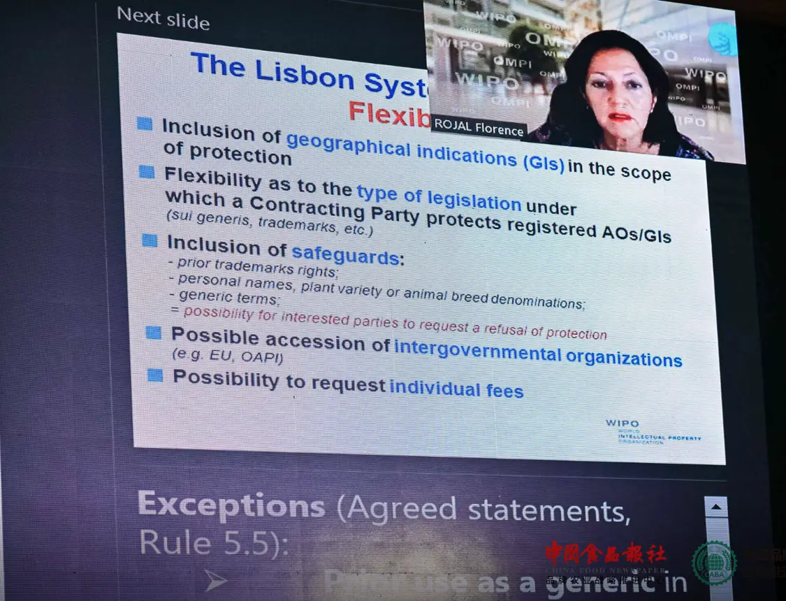 世界知识产权组织地理标志项目专家弗洛伦斯·罗哈尔通过视频演讲的方式分享了国际地理标志保护。