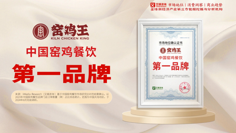 2024年6月,窑鸡王获全球新经济产业第三方数据挖掘和分析机构iiMedia Research(艾媒咨询)授予的“中国窑鸡餐饮第一品牌”“窑鸡餐饮连锁企业全国规模第一”“窑鸡餐饮连锁企业全球规模第一”“中国窑鸡餐饮销量第一” 四项市场地位确认。