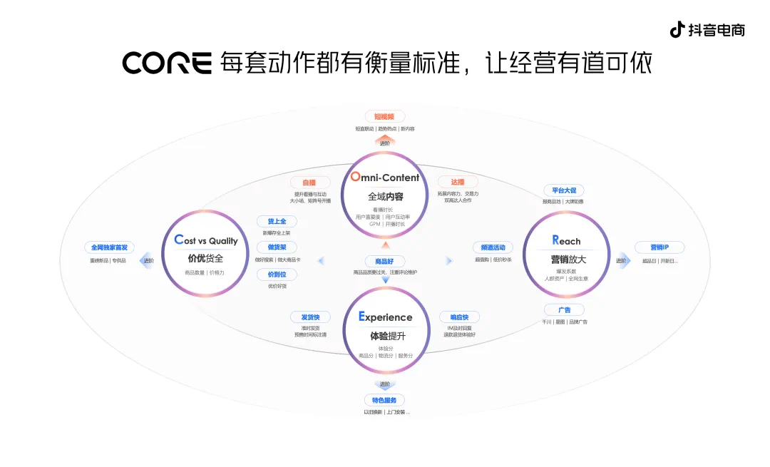 CORE有基础版和进阶版,对商家来说实践CORE没有止境,商家在抖音电商上的成长速度跟CORE的实践程度正相关。
