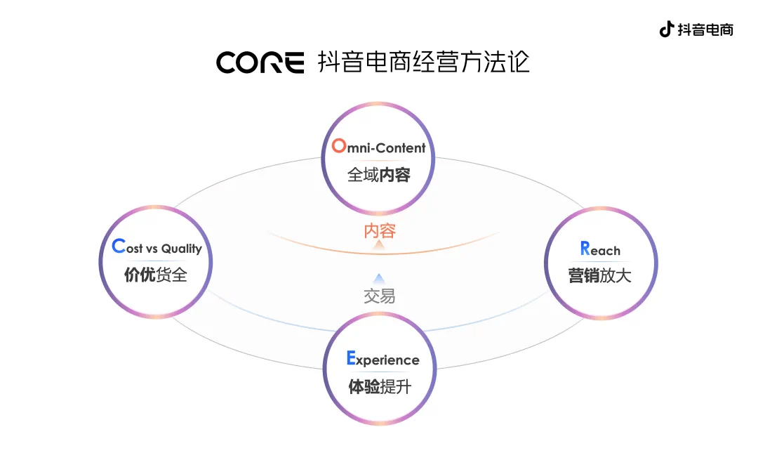 因为如今的抖音电商早已跑通了“货找人”和“人找货”的双向链路,所以新的方法论从全域视角出发,用CORE四件事的经营能力来指导商家的流量分配,也进一步提升了商家获得流量的确定性——