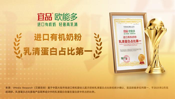 2025年2月,欧能多获全球领先的新经济产业第三方数据挖掘和分析机构 iiMedia Research(艾媒咨询)授予的" 进口有机奶粉乳清蛋白占比第一 "市场地位确认。