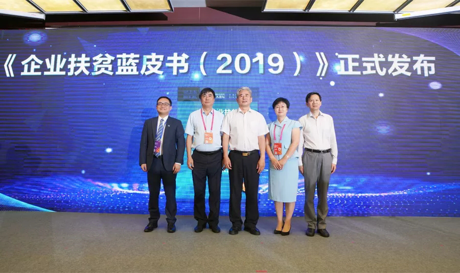 国务院扶贫办社会扶贫司司长曲天军,国务院国资委科技创新和社会责任局副局长张晓红,全国工商联扶贫与社会服务部二级巡视员邵逸,清华大学社会创新与乡村振兴研究中心主任邓国胜,中国社科院课题组组长、中国社会责任百人论坛秘书长钟宏武共同发布《企业扶贫蓝皮书(2019)》