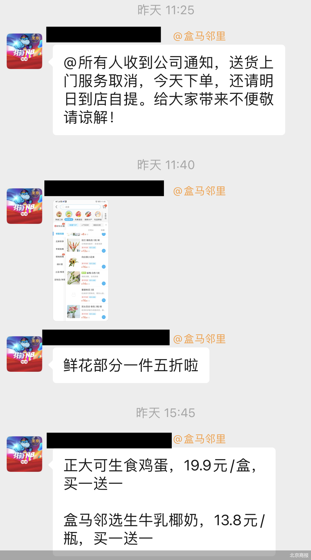 在一家盒马邻里的微信群里,北京商报记者注意到,在4月1日中午11点25分,店员在微信群发消息称,“收到公司通知,取消送货上门服务,今天下单需明日到店自提”。同时,群内盒马鲜花以一件5折方式迅速“甩卖”,正大可生食鸡蛋、盒马邻选生牛乳椰奶等商品均买一送一。当日晚间9点,另一位店员在群里发了一张《服务调整通知》,表示站点暂停营业。