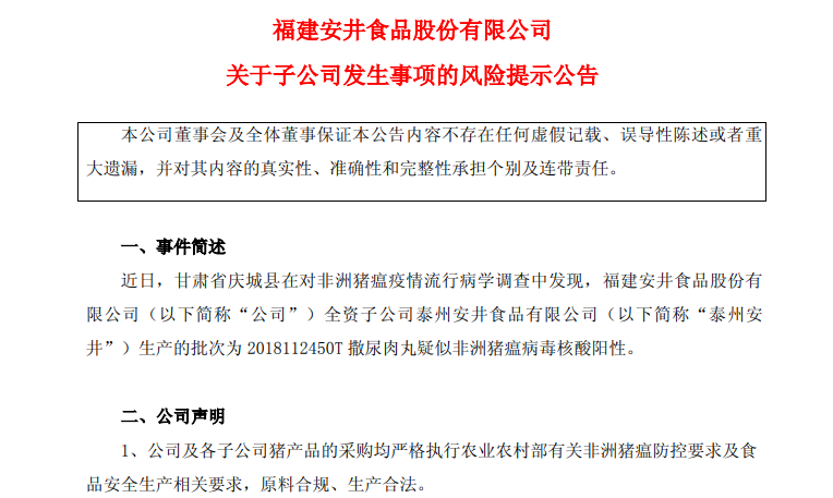 早在1月22日,上市公司安井食品就曾发布公告称,旗下子公司泰州安井食品有限公司生产的批次为2018112450T的撒尿肉丸疑似非洲猪瘟病毒核酸阳性。该批产品被发现疑似非洲猪瘟病毒,是近日甘肃省庆城县在对非洲猪瘟疫情流行病学调查中发现的。