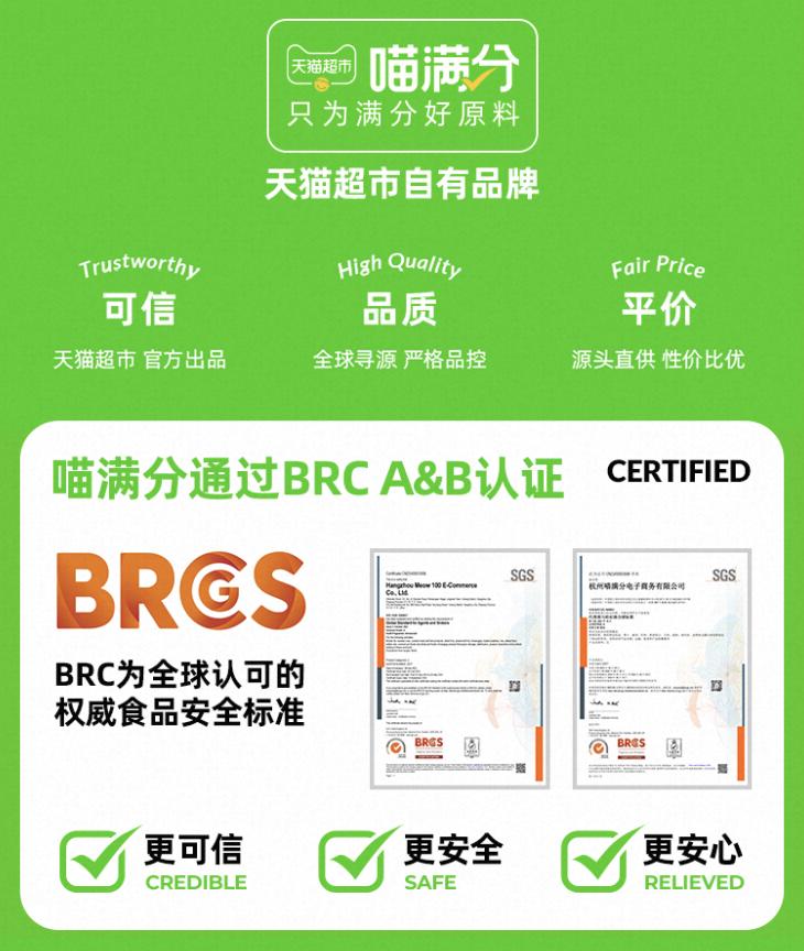 8月18日,天猫超市旗下自有品牌“喵满分”正式获得通标标准技术服务有限公司(简称SGS)颁发的BRCGS A&B认证证书,标志着旗下食品及宠物食品安全质量获国际权威认可。