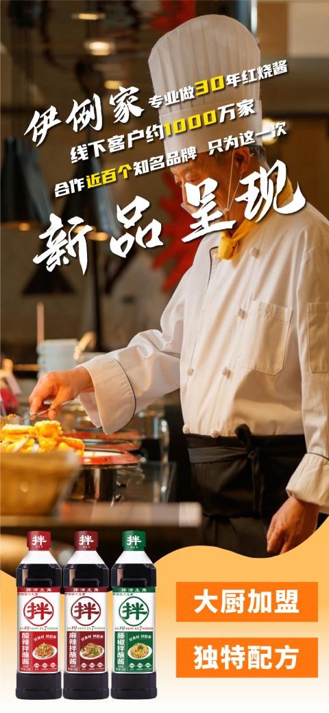 伊例家专业做30年红烧酱,一直致力服务于线下餐饮品牌及连锁餐饮酒店,线下客户约1000万家,合作近百个知名品牌。此次新上市的拌蘸酱更是凝聚了多位大厨顾问的心血与智慧,打破传统调味汁单一口感,采用独特的配方与工艺,含有十九种香辛料、七种诱惑味道,挣脱出了大众对于食材最朴素的原始想象力,打造出别具一格的风味体验。