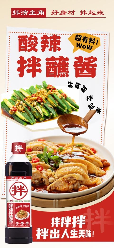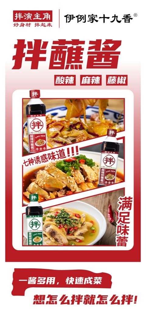 近几年,随着调味品功能化、碎片化需求的加剧,越来越多细分品类开始出现在消费者的厨房,由此调味汁、点蘸汁和油醋汁掀起一股风潮,从初创品牌纷纷布局到大品牌入局,逐渐成为调味品市场新贵。2024年伊例家深入市场,创新研发了三款拌演主角系列拌蘸酱,一经面市,迅速占据厨房重要位置。