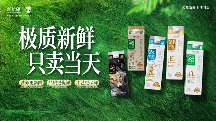 随着消费者对奶业质量要求的不断攀升,新希望乳业将“鲜”战略落地到产品,推出全球首款以时间定义新鲜的鲜奶产品——24小时鲜牛乳,打破了行业巴氏鲜奶5-7天的销售期思路,承诺“新鲜只卖当天”,带动乳业市场转向“鲜”潮流。从1.0到4.0,24小时鲜牛乳不断刷新低温优质乳的新鲜营养标准。2011年至今,24小时鲜牛乳不断升维,从奶源、工艺等影响鲜奶营养指标的重要维度上进行突破,完成了杀菌工艺从95°C到72°C的升级,免疫球蛋白含量从普通鲜奶的约10倍不断攀升至25倍,形成了24小时鲜牛乳、24小时黄金营养乳、24小时铂金全优乳、24小时限定娟姗乳、24小时鲜活有机乳5款产品矩阵,将鲜活做到极致。